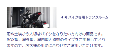 BOX型、屋外型、室内型と複数のタイプをご用意したバイク専用の収納スペース。